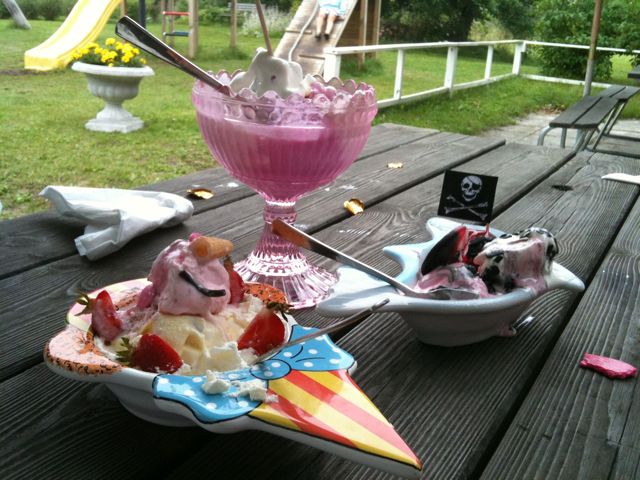 En kombination av dåligt samvete och muta för att få tyst i bilen får mig lova glass före lunch. Då dyker glassrestaurangen upp några minuter senare vid vägen. Där sätter vi oss och beställer 4 glass-rätter för 450 kr. I vanliga fall skulle vi vänt även här vid såna priser om det inte vore för att det framstod som billigt i jämförelse med vad vi precis lyckats undvika.