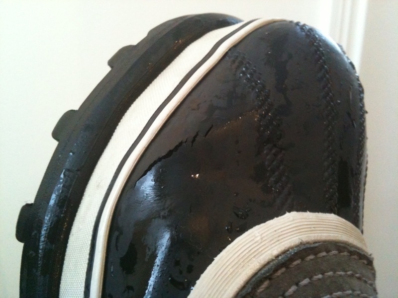Själv börjar jag bli blöt om fötterna för att mina Sorel-kängor gått sönder. Efter två månaders användning är det en spricka i gummit: