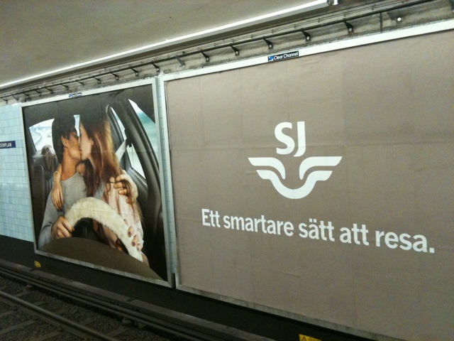 Vad bra det kan bli om man håller det enkelt. Tydligt budskap (”du får tid över till annat när du åker tåg”), bra bild (hånglande par som fångar blicken och något som inte stämmer i bilden som det undermedvetna registrerar så man stannar kvar), och rak payoff. Äntligen har SJ slutat kasta annonspengarna i sjön!