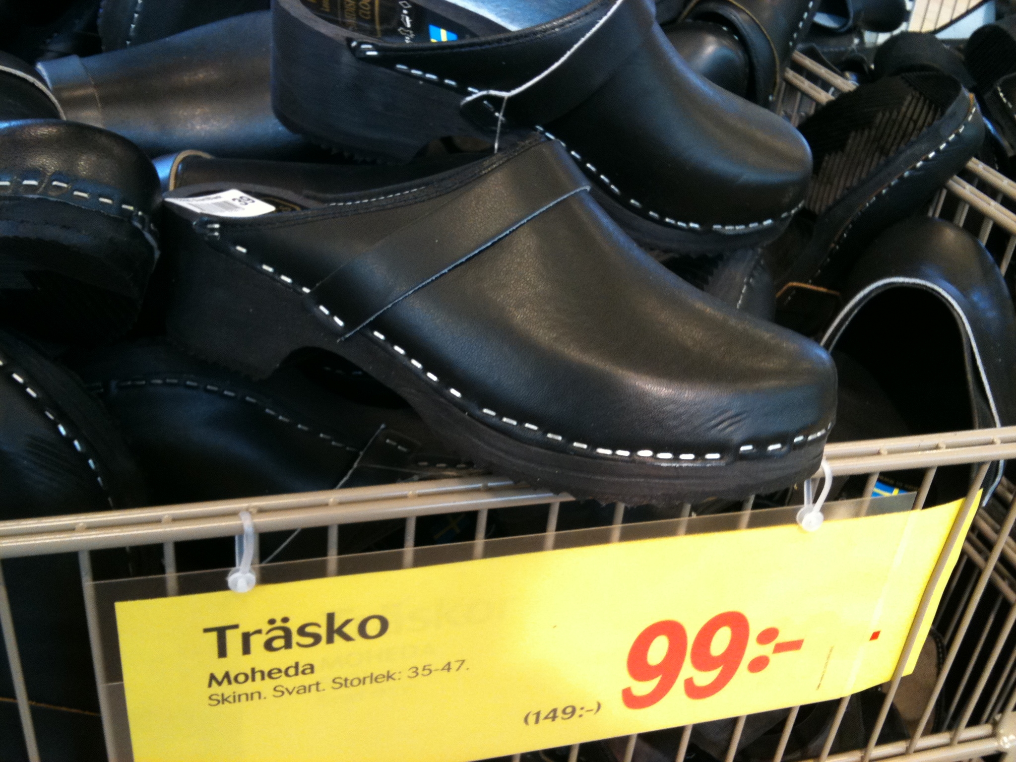 Förresten, jag har en affärsidé för den som vill ge sig in i träskomarknaden innan det är för sent. Läser på di.se att Moheda (som tillverkar den som kostar 99 kr på bilden ovan) också ryckts med av bara farten i träskohajpen. Omsättningen har ökat med 10% och familjeföretaget kan nu stoltsera med återförsäljare som varuhuset Lafayette i Paris. Låt mig gissa att ”Les pantoufles de bois suédois” inte bara kostar 10 euro i Paris. Man borde åka ut till Coop och köpa upp allt de har och sen dra ned till Frankrike och sälja dem 1000% dyrare. Det kan nog finansiera en månad på rivieran. Vem hakar på?
