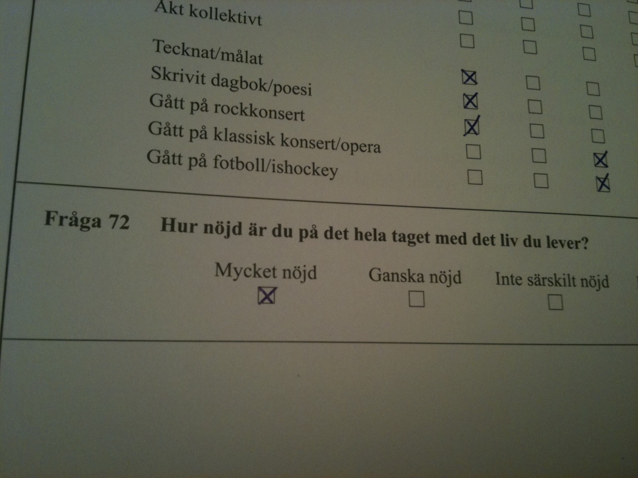 Fyllde i enkät från JMK vid GU med frågor om alltifrån ”Vad är det som gör att en nyhet tas upp i media?” till ”När gick du senast på fotboll?”. Men den bästa frågan var den sista, nr 72. Den frågan man borde ställa sig åtminstone en gång per år, för att se om man är på rätt väg i livet: