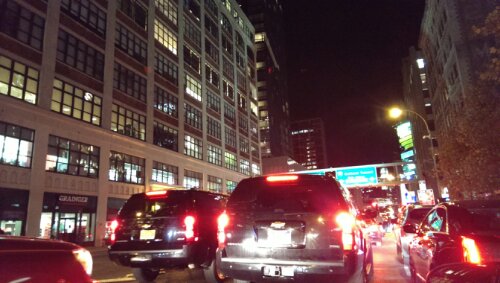 18.04. Kö ned i Holland tunnel. Taxichauffören talar om att han önskar detta var en helikopter istället. Börjar bli lite orolig…