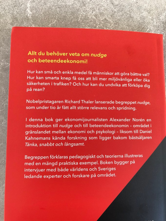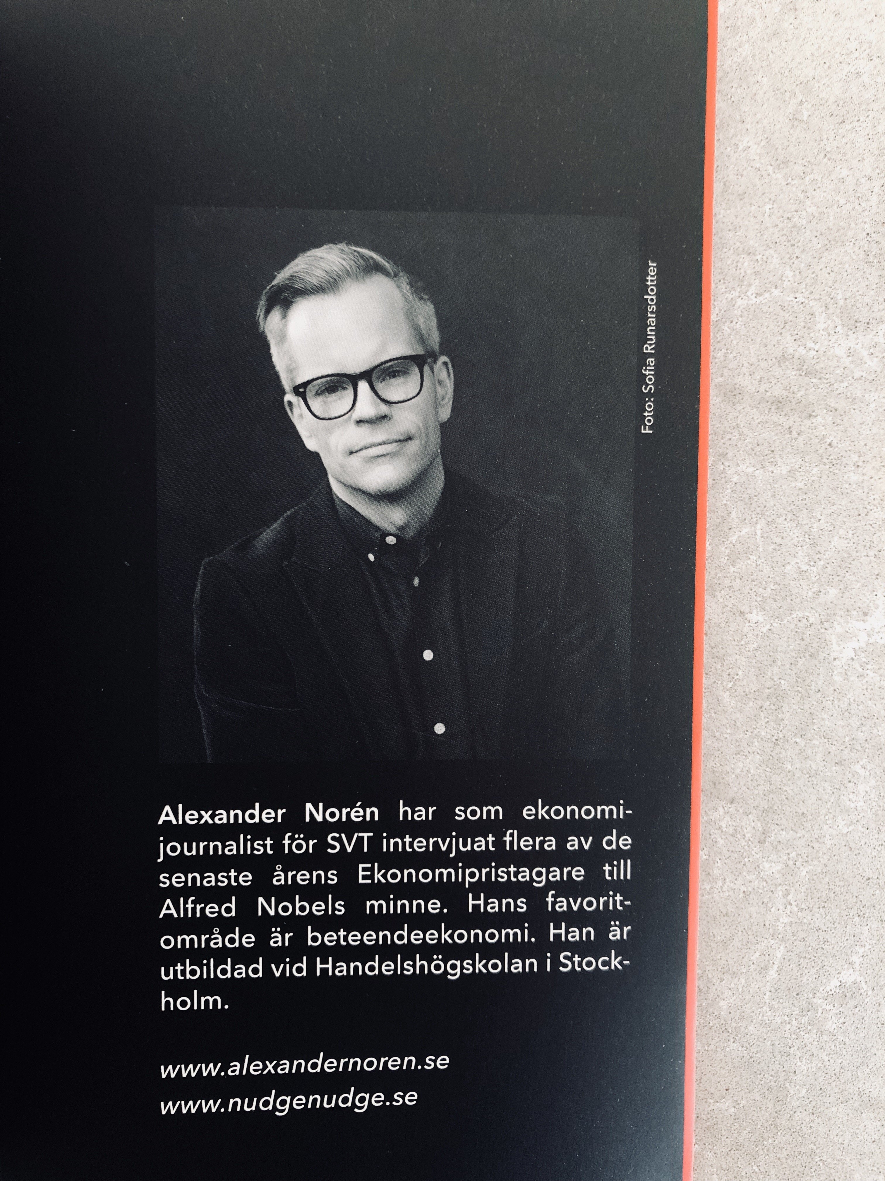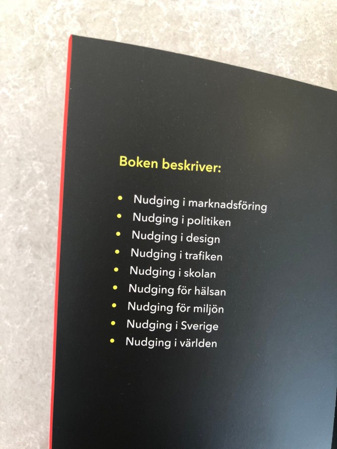 Nu är den äntligen ute, min nya bok! ”Nudge: så funkar det” handlar om nudging – konsten att göra det lätt att välja rätt. Rätt, i bemärkelsen det val du skulle gjort om du hade haft tillgång till rätt kunskap och tillräckligt med självkontroll för att göra det. Utgångspunkten i beteendeekonomi är nämligen att vi inte alltid fattar fullt rationella beslut. Jag går igenom de vanligaste beslutsfällorna och hur man kan göra för att minska risken för att falla däri. Det handlar om att designa valsituationer på ett sätt som ”knuffar” oss i rätt riktning. Boken innehåller även en genomgång av hur företag som Spotify och Ica samt offentliga organisationer jobbar med nudging i Sverige och resten av världen, och bygger på intervjuer med några av världens ledande forskare inom området. Inte minst nudgingens ”pappa”, Richard Thaler, som jag haft nöjet att träffa flera gånger. Läs mer på nudgenudge.se och självklart i boken!